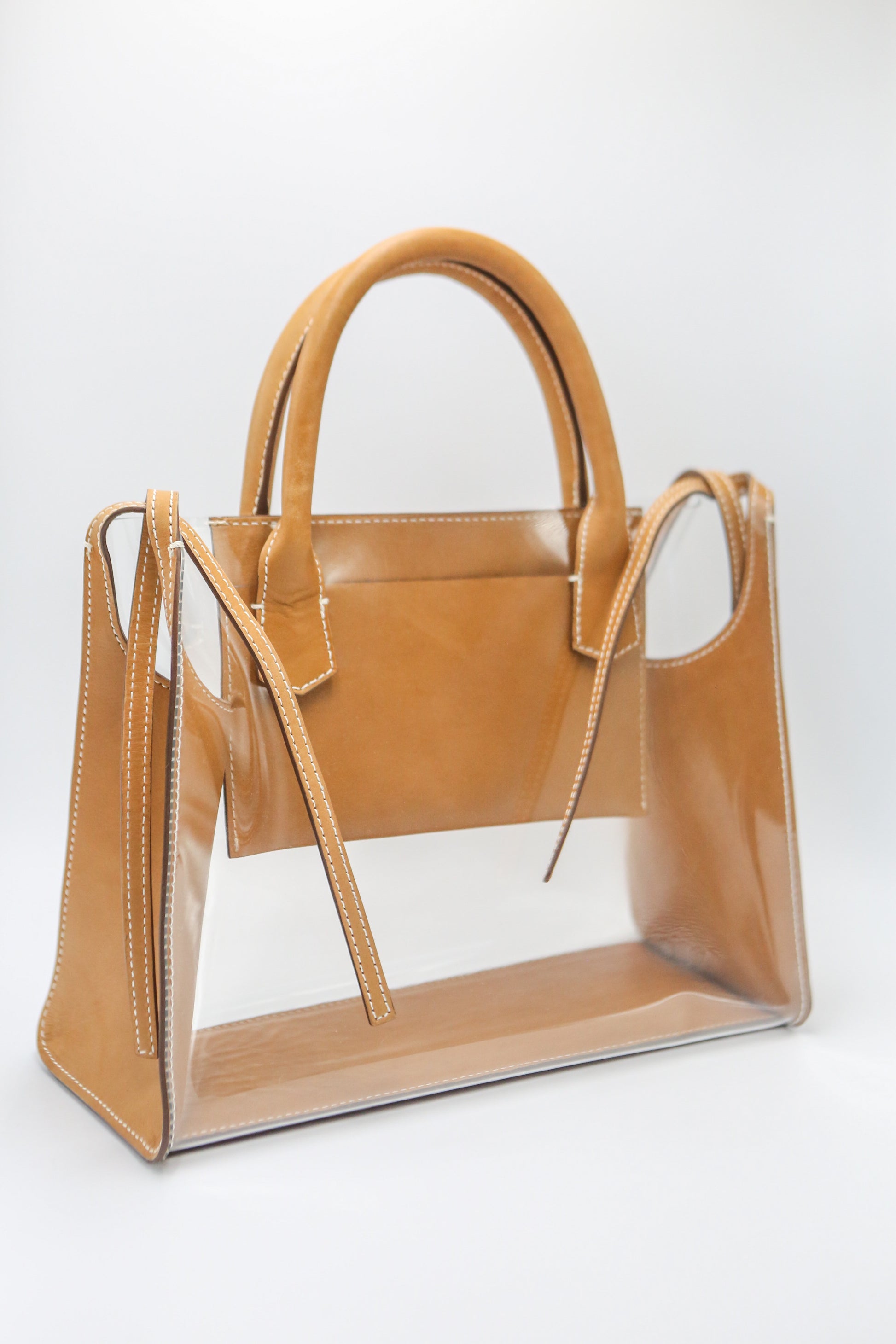 The BounBoun Glass Original is made from crystal-clear PVC and natural cowhide leather. Phone slides easily into the roomy side pocket.